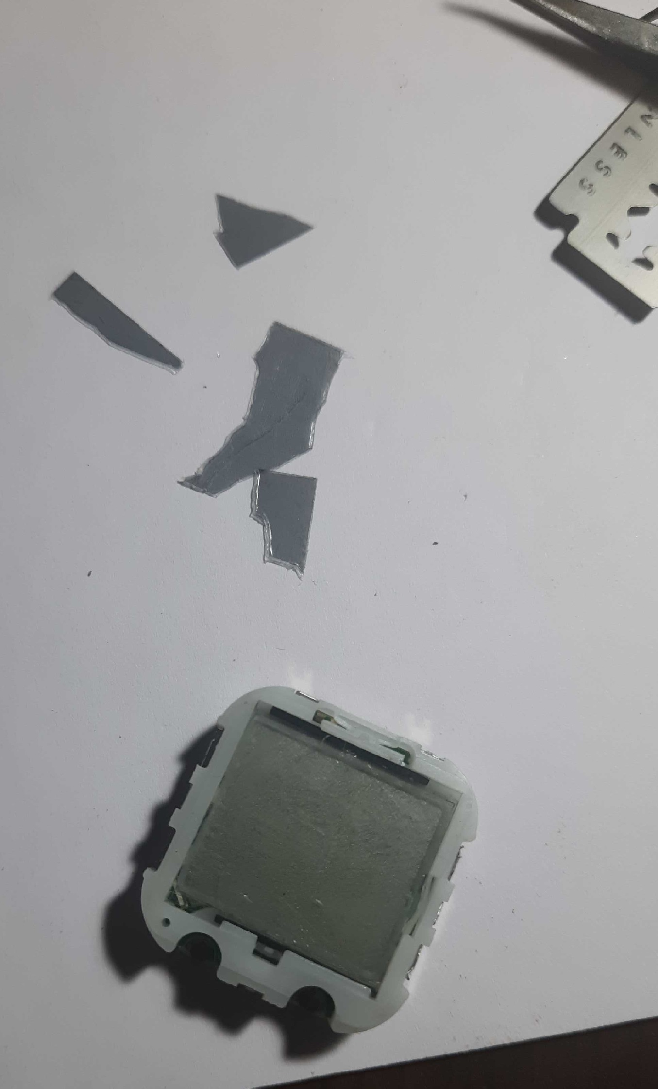 In simple terms this mod i.e. modification basically takes the display, and inverts its colours. Now what does that do ? It makes me a cooler person. It is achieved by removing the old polarizing filter and putting on a new filter that blocks and allows the opposite directions of polarized light, generating this effect. I tried it on this watch since it is pretty old and beat up. Even though it may be beat up, I hold a lot of attachment for this watch and this modification adds some more to it. Below you can see the display without the filter, bear in mind that it is still running. Only the light in the black regions isn’t blocked by the filter to produce the dark numbers. The pieces of filter above appear dark as they block some amount of the light from my lamp which is not polarized in the preferred direction. In the watch they do the same but in specific regions to produce the numbers.