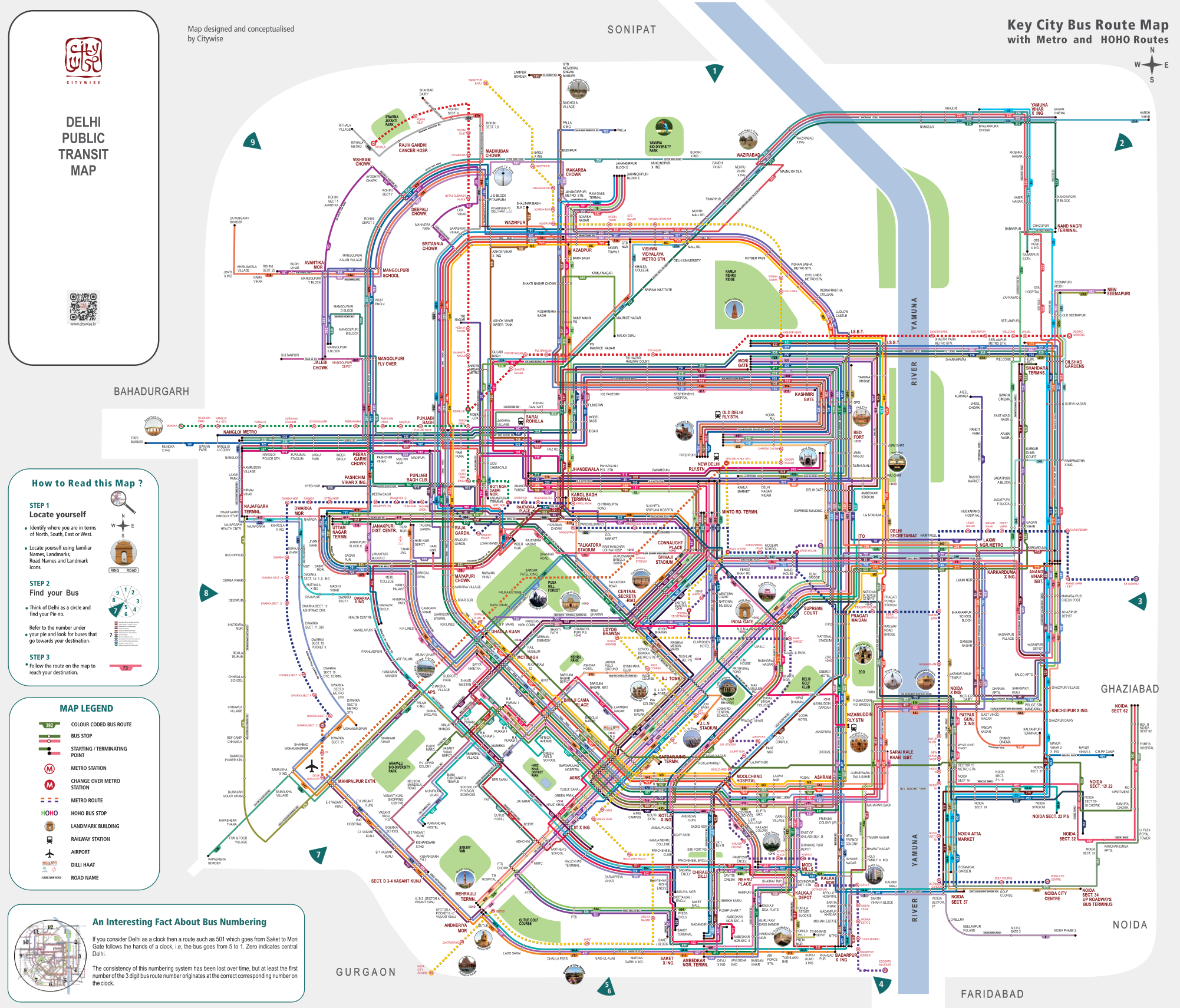 Such maps were initially installed at major bus depots and bus stops in central as well as regions of outer Delhi. Compared to the current squared-off bus route maps we find in some regions of Delhi the maps designed by Citywise had a more natural circularity to it, much like the city.